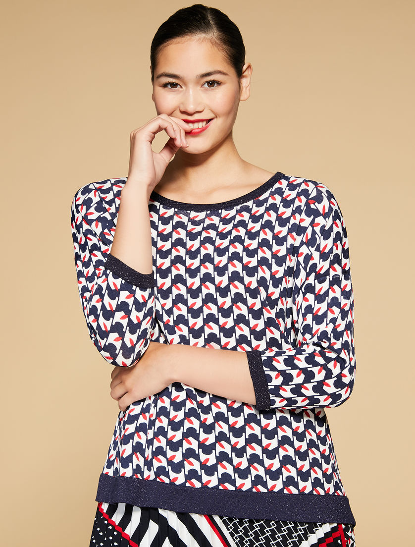 Descrizione: Maglia in viscosa stretch stampata, dalla linea morbida, con profili rifiniti a tinta unita con lurex, collo ampio tondo, maniche lunghe con spalle scese.