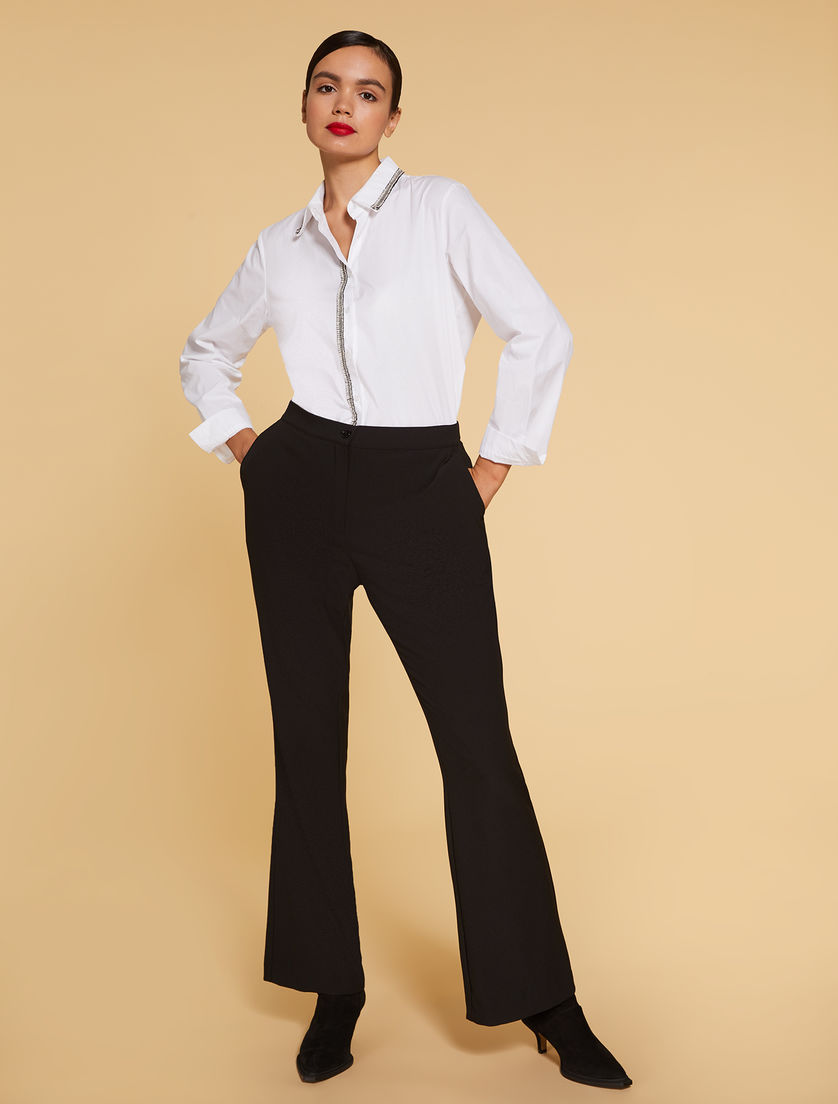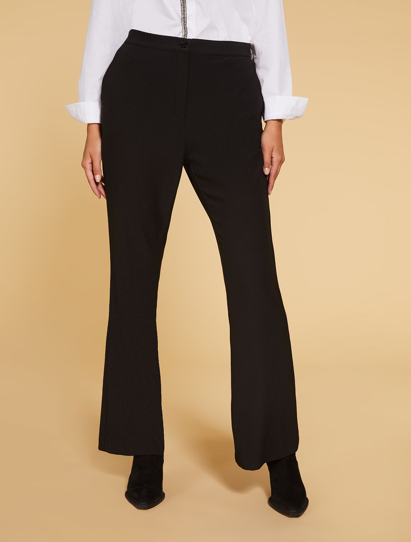 Descrizione: Pantaloni in crêpe stretch, dalla linea flare, con pinces in vita sul retro e tasche alla francese ai fianchi. Chiusura con zip coperta e bottone.